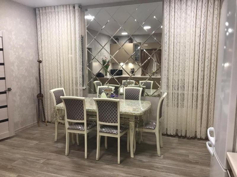 Использована серебристая зеркальная плитка восьмиугольной и квадратной формы.